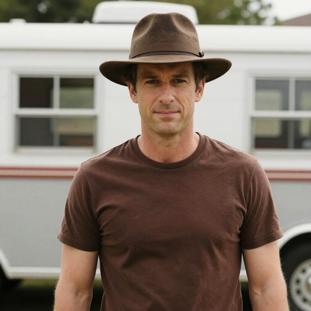 A man wearing a brown shirt and a matching brown fedora hat stands confidently in front of a white trailer. His casual attire and the trailer setting evoke a relaxed, outdoorsy vibe often associated with trailer park life or rustic settings.