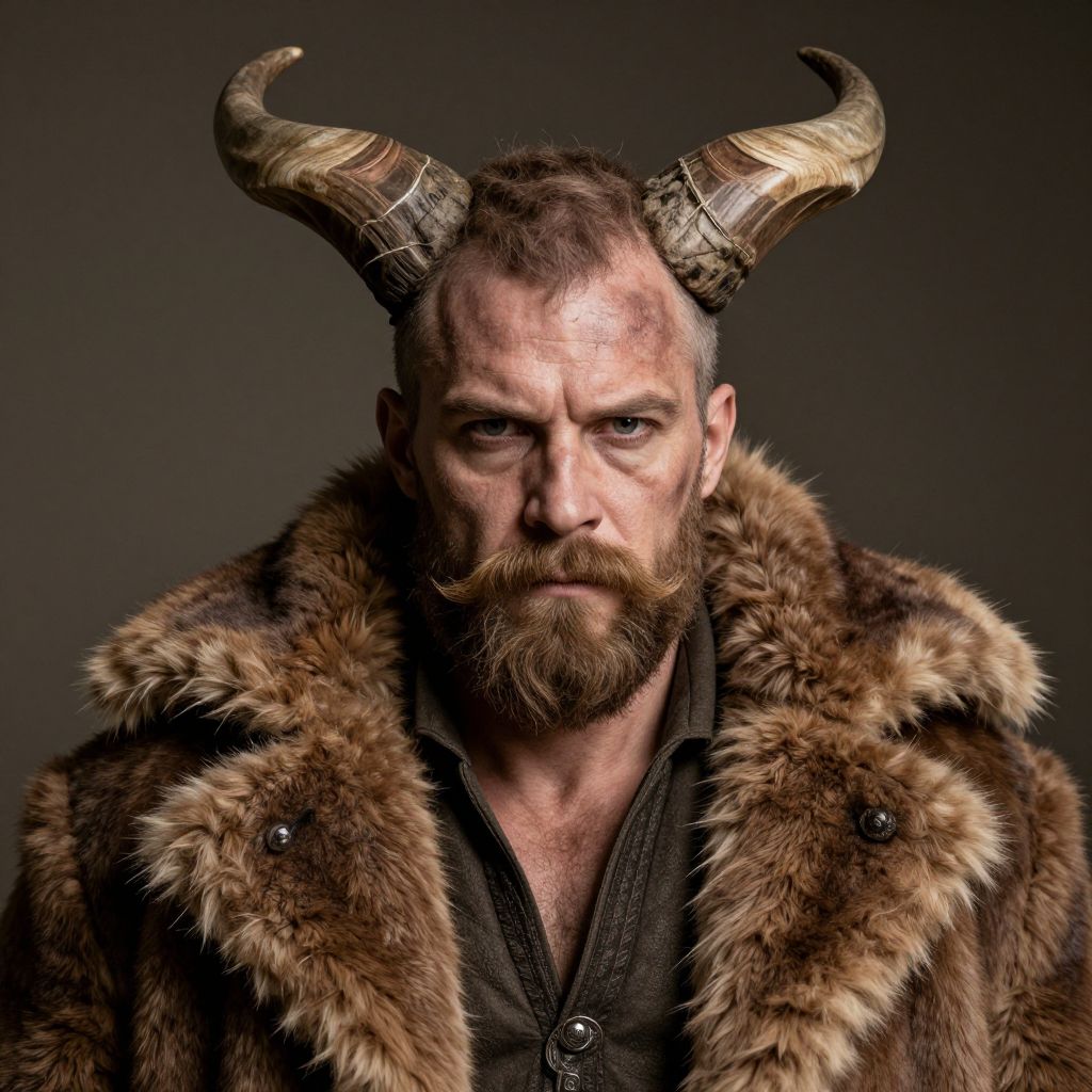 Viking Man with Horned Headgear and Fur Coat Portrait