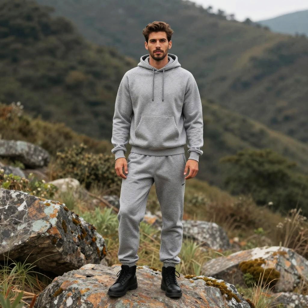 A man stands confidently on a rock in a mountainous landscape, dressed in a comfortable grey sweatsuit consisting of a hoodie and jogger pants. The casual athleisure outfit paired with rugged black boots highlights a blend of outdoor adventure and relaxed style.