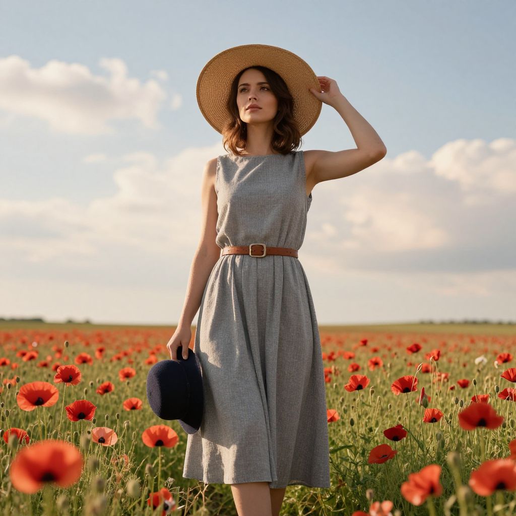 A woman stands gracefully in a vibrant poppy field under a partly cloudy sky, wearing a simple, sleeveless gray dress cinched with a brown belt. She holds a navy hat in her left hand while adjusting a wide-brimmed straw hat with her right, capturing a serene and timeless pastoral scene.