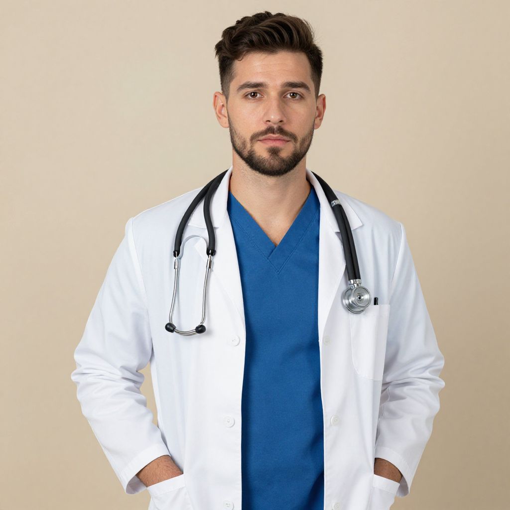 A confident male doctor wearing a white lab coat over blue scrubs stands against a plain beige background. He has a stethoscope draped around his neck and looks directly at the camera with a calm and professional expression.