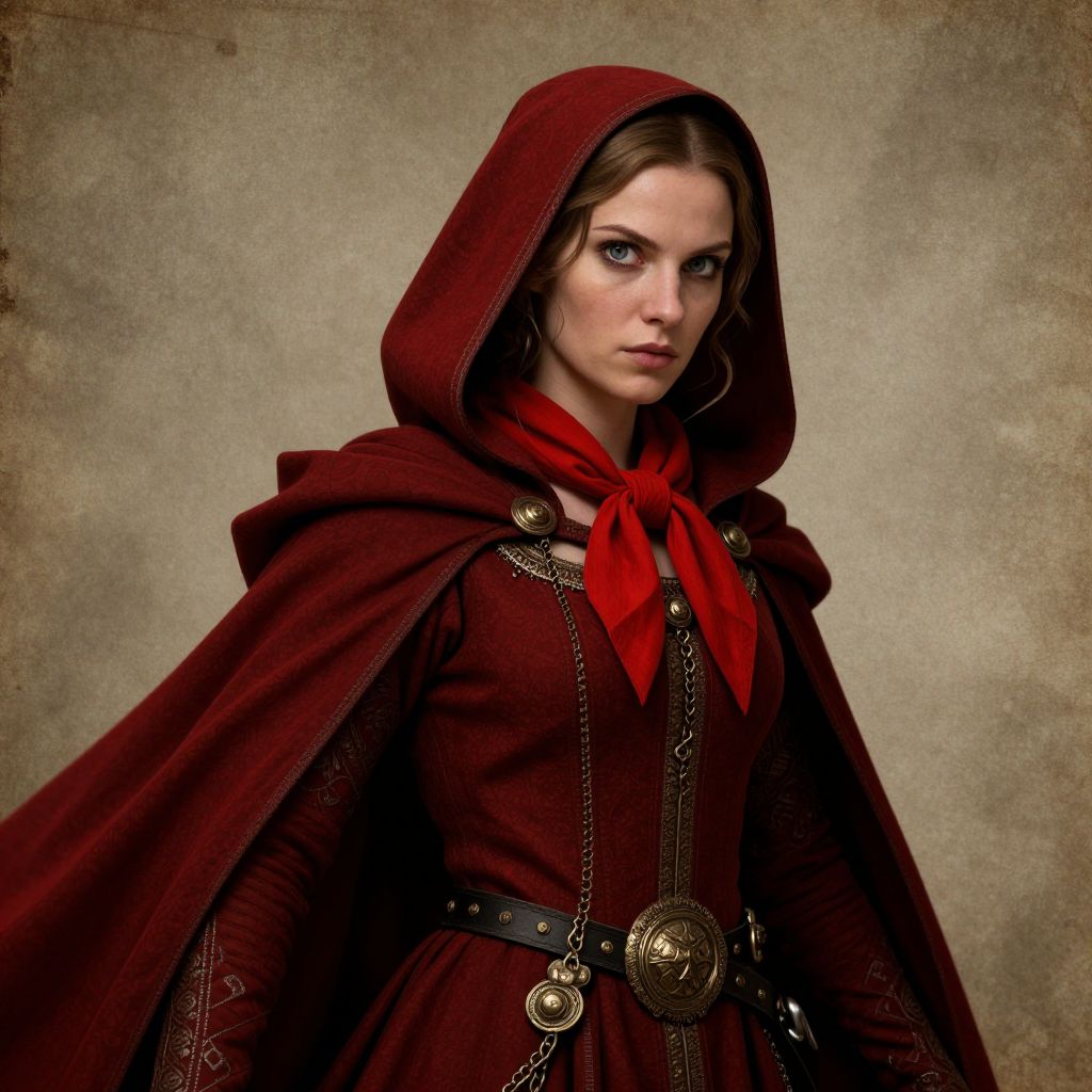 A woman dressed in an intricately designed medieval costume, featuring a deep red hooded cloak and a matching dress adorned with ornate golden clasps and a detailed belt. Her intense gaze and the vintage textured background heighten the historical and dramatic atmosphere of the portrait.