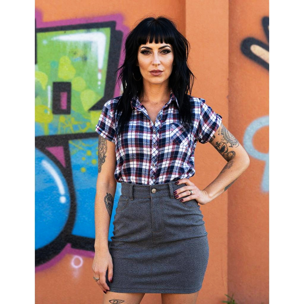 A confident woman with black hair and distinctive tattoos poses against a vibrant graffiti wall. She wears a plaid short-sleeve shirt tucked into a high-waisted gray skirt, exuding an edgy yet stylish urban vibe.