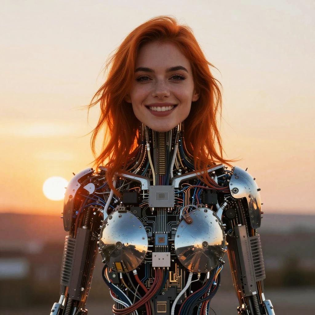 A smiling woman with vibrant red hair is depicted as a futuristic android, combining human features with highly detailed cybernetic components and circuitry. The image showcases advanced robotic design against a warm sunset background, highlighting a seamless blend of humanity and technology in a sci-fi style.