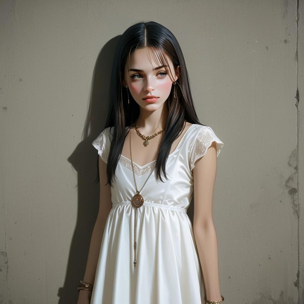A young woman with long dark hair stands against a textured wall, wearing a flowing white dress with delicate lace details on the sleeves. The illustration style is hyper-realistic with a digital painting technique that highlights subtle shadows and soft lighting, creating a polished and elegant look.