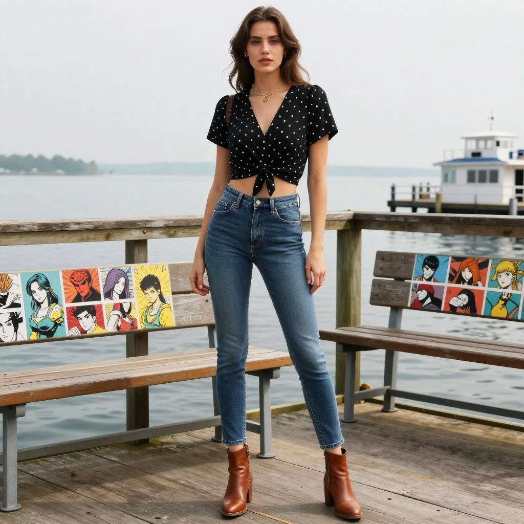 A woman stands confidently on a wooden dock by the water, dressed in a casual chic style featuring a cropped black top with white polka dots tied at the waist, paired with high-waisted blue jeans and brown ankle boots. The serene lake backdrop and colorful anime artwork on benches contrast stylishly with her modern outfit.