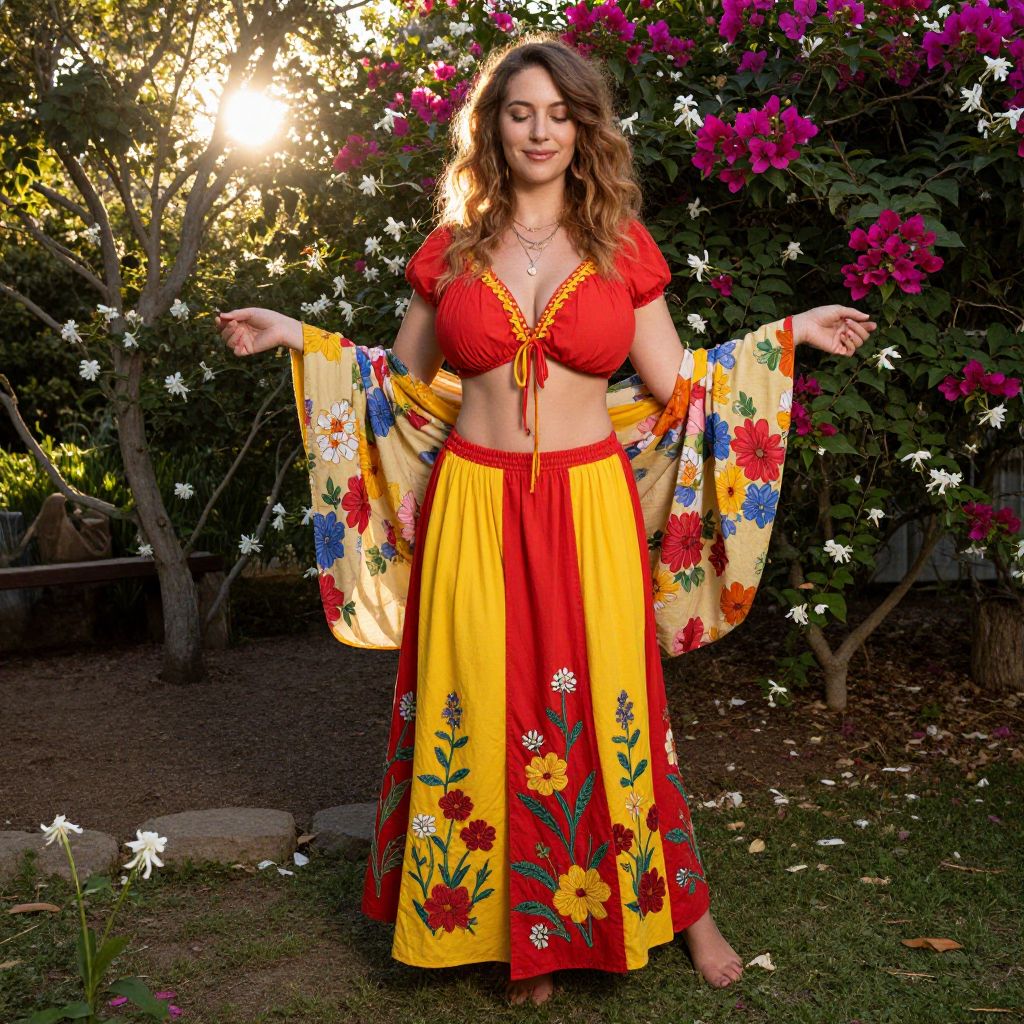 A woman in a vibrant bohemian-style outfit stands barefoot in a lush garden, surrounded by colorful flowers and greenery. She wears a red and yellow skirt adorned with floral embroidery and a matching crop top, with a floral shawl draped gracefully over her arms, exuding a carefree and joyful vibe under the warm sunlight.