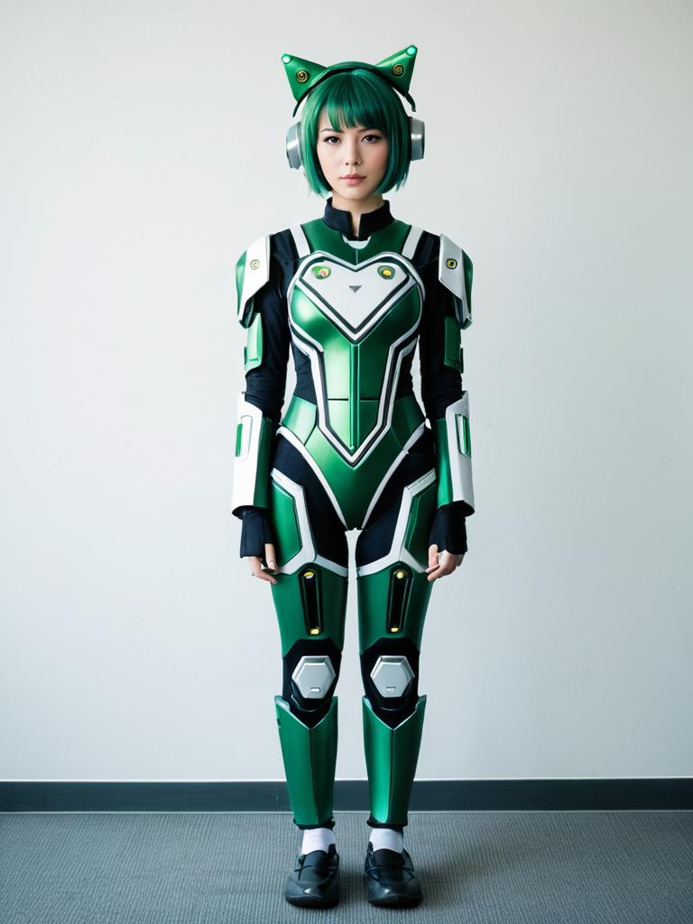 A woman dressed in a futuristic green and white armored suit with cat-ear headphones stands against a plain background. The outfit features sleek, sci-fi inspired design elements, highlighting a modern and stylish take on robotic armor with vibrant colors and intricate details.