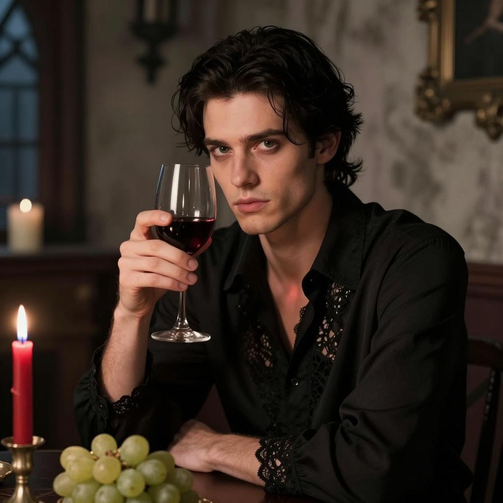 A young man with dark, wavy hair is seated at a table holding a glass of red wine, dressed in a black lace-trimmed shirt that reflects a gothic or vintage-inspired style. The dimly lit background with candles and classic decor adds a moody and sophisticated atmosphere to the portrait.