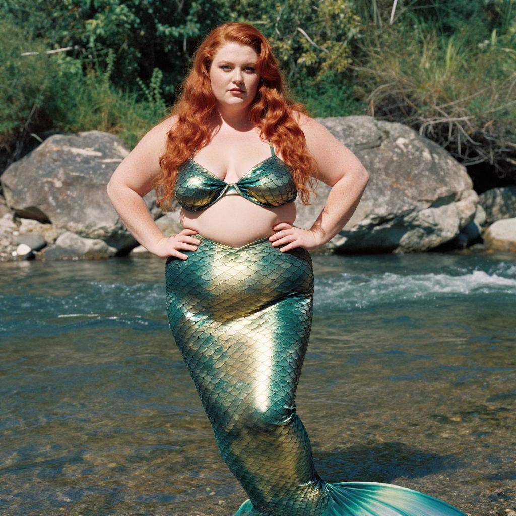 A confident woman with long red hair poses in a shimmering green mermaid tail costume by a clear river with rocks and trees in the background. The fantasy-inspired outfit features scale-like textures, evoking a mythical mermaid look in a natural outdoor setting.