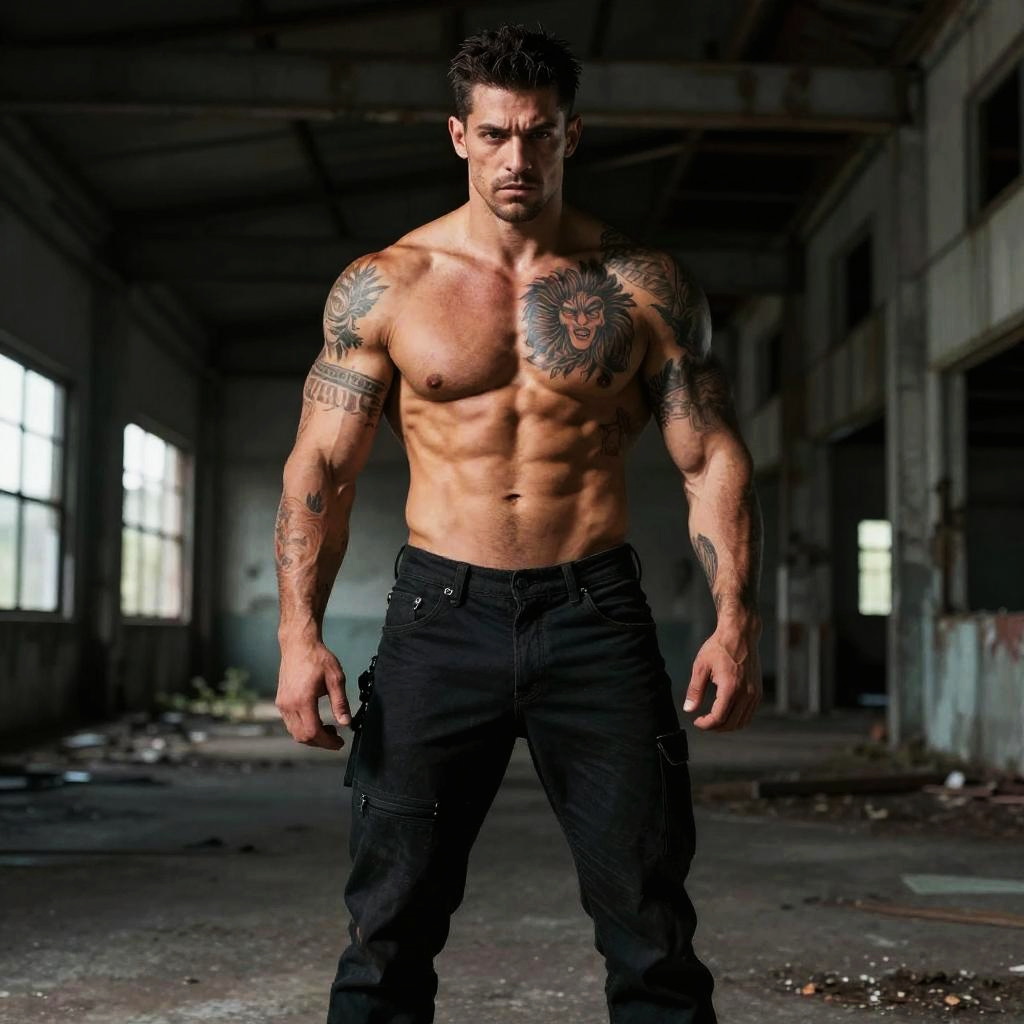 A muscular man with extensive tattoos stands confidently in an abandoned industrial building, showcasing his toned physique and intense expression. The photo highlights his strong presence and detailed body art in a gritty, urban environment.