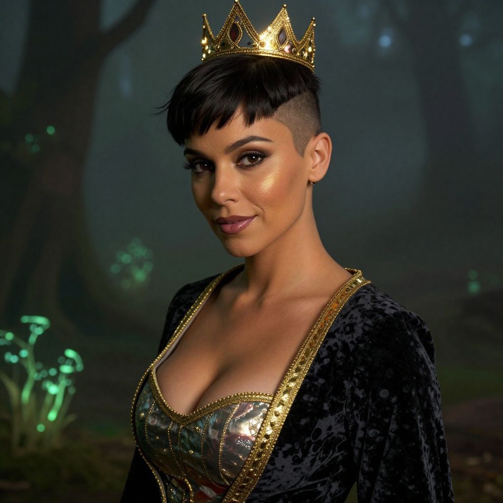 A confident woman with a short, edgy haircut wears a golden crown and a luxurious black velvet gown with intricate gold detailing. The image combines modern style with royal fantasy elements, set against a dark, mystical forest background with glowing plants. The composition highlights her poised expression and regal presence.