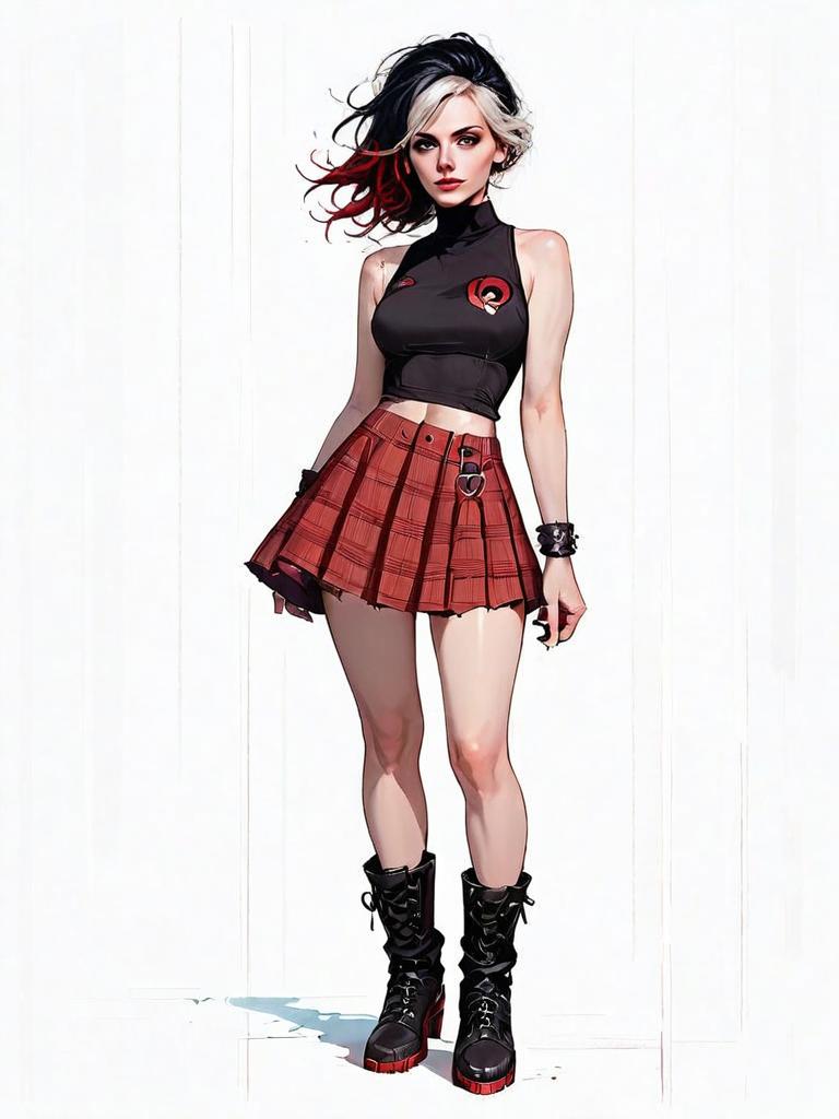 This digital artwork depicts a confident young woman in a punk-inspired outfit, featuring a black cropped sleeveless top and a red plaid pleated skirt, paired with black combat boots. Her striking hair, styled in contrasting black and white with a hint of red, complements the edgy and contemporary comic-style illustration.