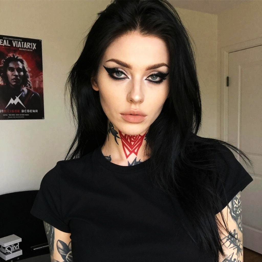 A young woman with striking black winged eyeliner and dark hair poses in a black t-shirt, showcasing her geometric red neck tattoo and intricate arm tattoos. The image features a modern, edgy aesthetic with a minimalistic indoor setting, highlighted by a poster on the wall in the background.