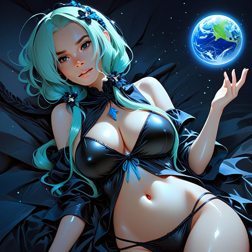 This digital illustration features a stylized anime woman with turquoise hair, dressed in revealing black glossy lingerie, lying on a dark surface. She holds a glowing miniature Earth in her hand, blending sci-fi and fantasy elements with a vivid, polished art style characteristic of modern anime art.