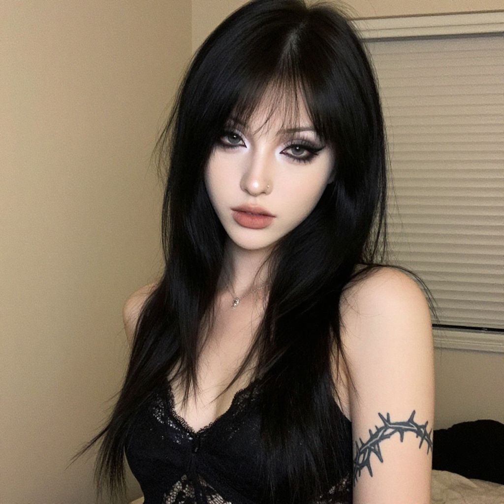 A young woman with long black hair and striking makeup poses indoors against a neutral background. She wears a black lace top, and a prominent barbed wire tattoo encircles her upper arm, adding an edgy aesthetic to the modern portrait.
