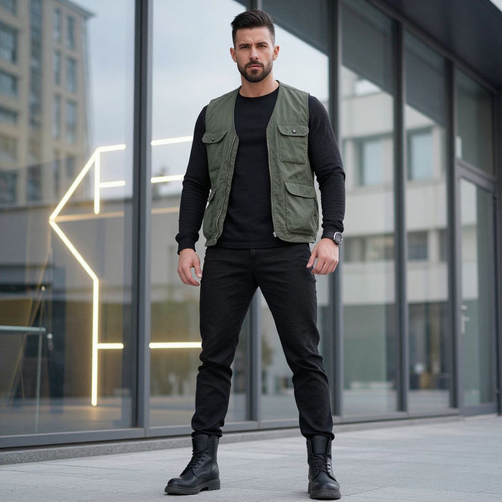 A confident man stands outdoors in a modern urban setting wearing a military green vest over a black long-sleeve shirt paired with black pants and black boots. His pose and attire convey a stylish, casual look with a utilitarian edge against the backdrop of sleek glass architecture.