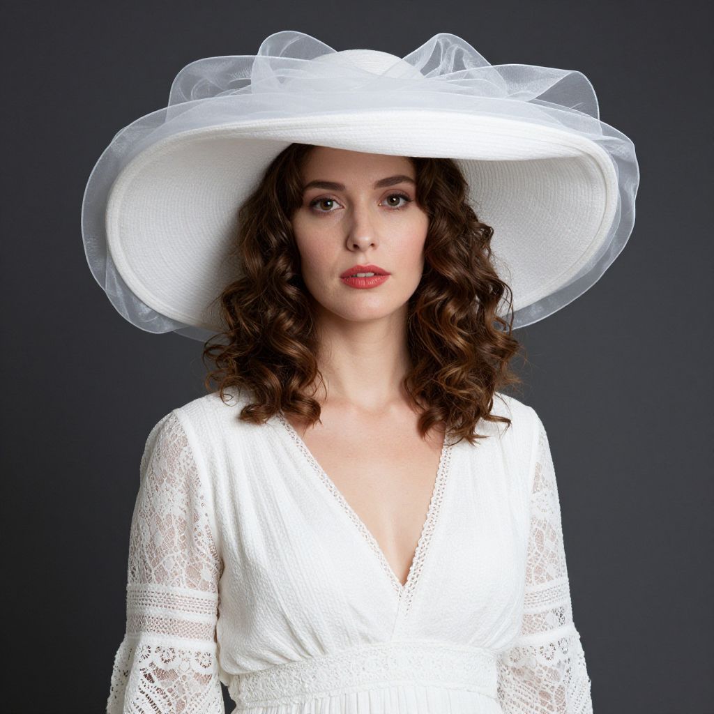 A woman with curly brown hair wears an elegant white lace dress paired with a large, wide-brimmed white hat adorned with sheer fabric accents. Set against a dark background, the image highlights her poised and sophisticated appearance with a vintage-inspired fashion style.