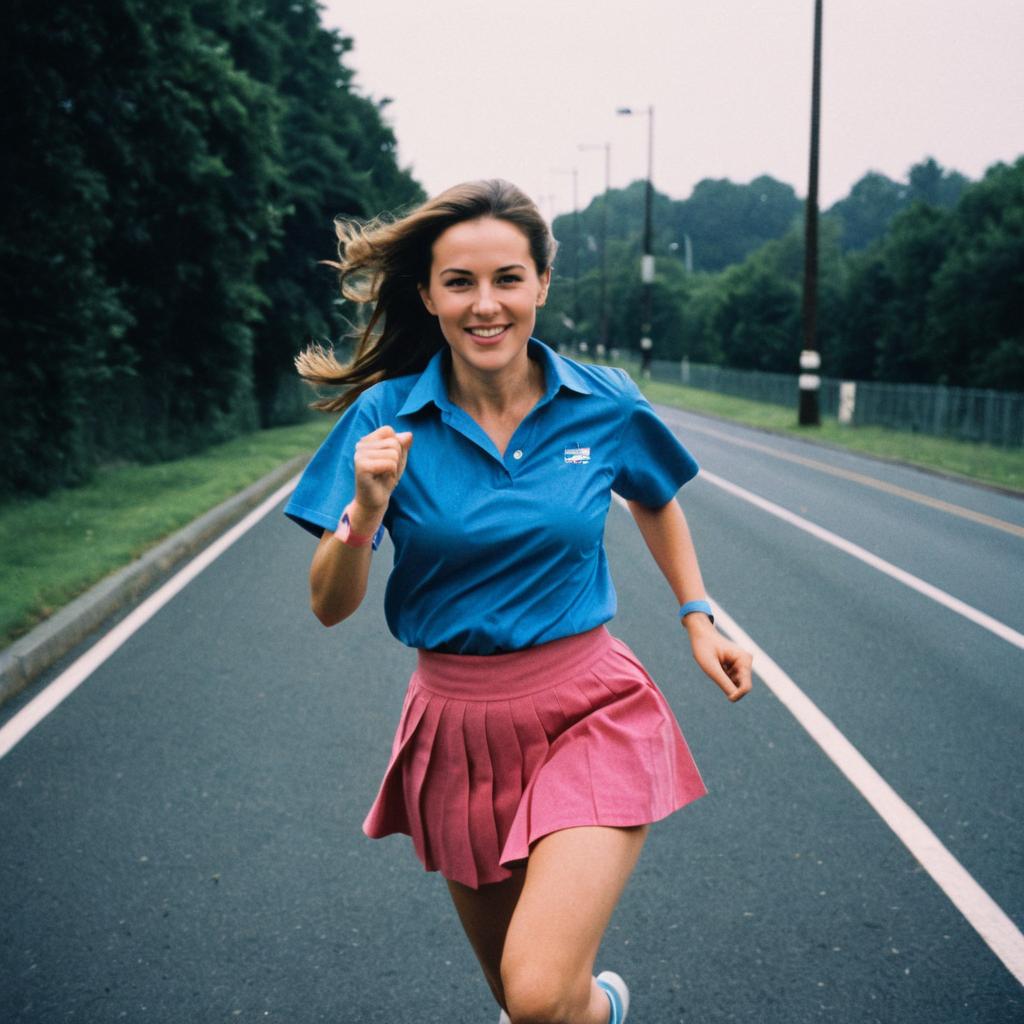 A woman is running energetically down an empty road wearing a bright blue polo shirt paired with a pink pleated skirt. The scene is set outdoors with trees lining the roadside, capturing a moment of fitness and vitality in casual athletic attire.