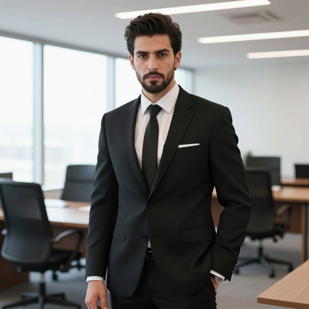 A confident man dressed in a tailored black suit, white shirt, and black tie stands in a modern office setting with large windows and ergonomic chairs. His composed expression and professional attire reflect a business environment with a contemporary corporate style.