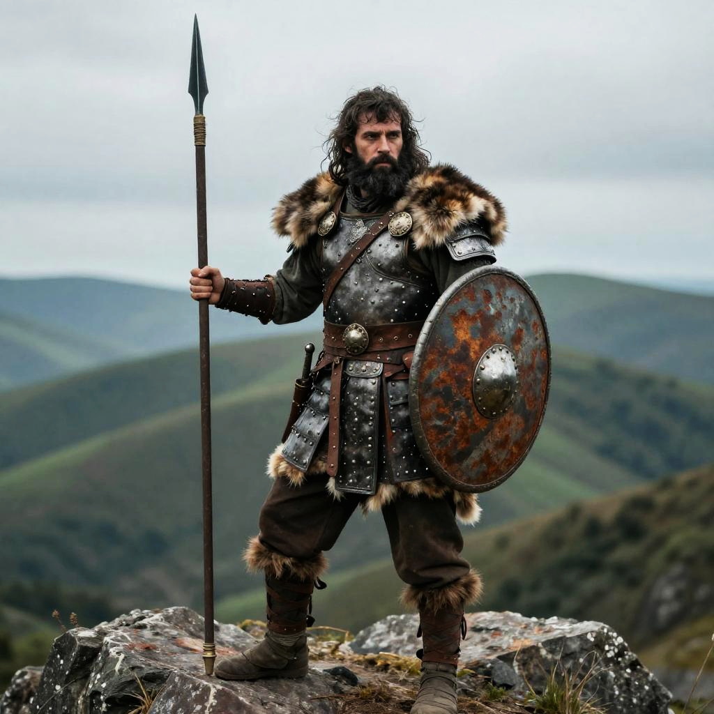A rugged man dressed as a medieval warrior stands confidently on a rocky hilltop, holding a spear in one hand and a rusted round shield in the other. His armor is accented with fur details, and the misty, mountainous landscape behind him adds to the atmospheric, historical feel of the scene.