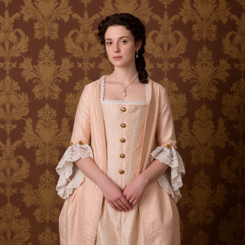 A woman poses elegantly against a richly patterned brown and gold damask wallpaper, dressed in a detailed 18th-century style gown featuring lace trimmings and gold buttons. Her hair is styled in curls, and she wears delicate jewelry that enhances the historical aesthetic.
