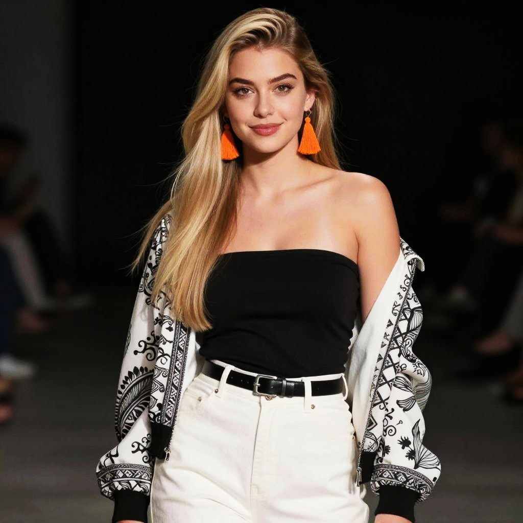 A stylish young woman confidently walks down the runway wearing a chic black strapless top paired with high-waisted white pants and a black and white patterned jacket draped over her shoulders. Her look is accentuated by vibrant orange tassel earrings, adding a pop of color to her modern and elegant ensemble.