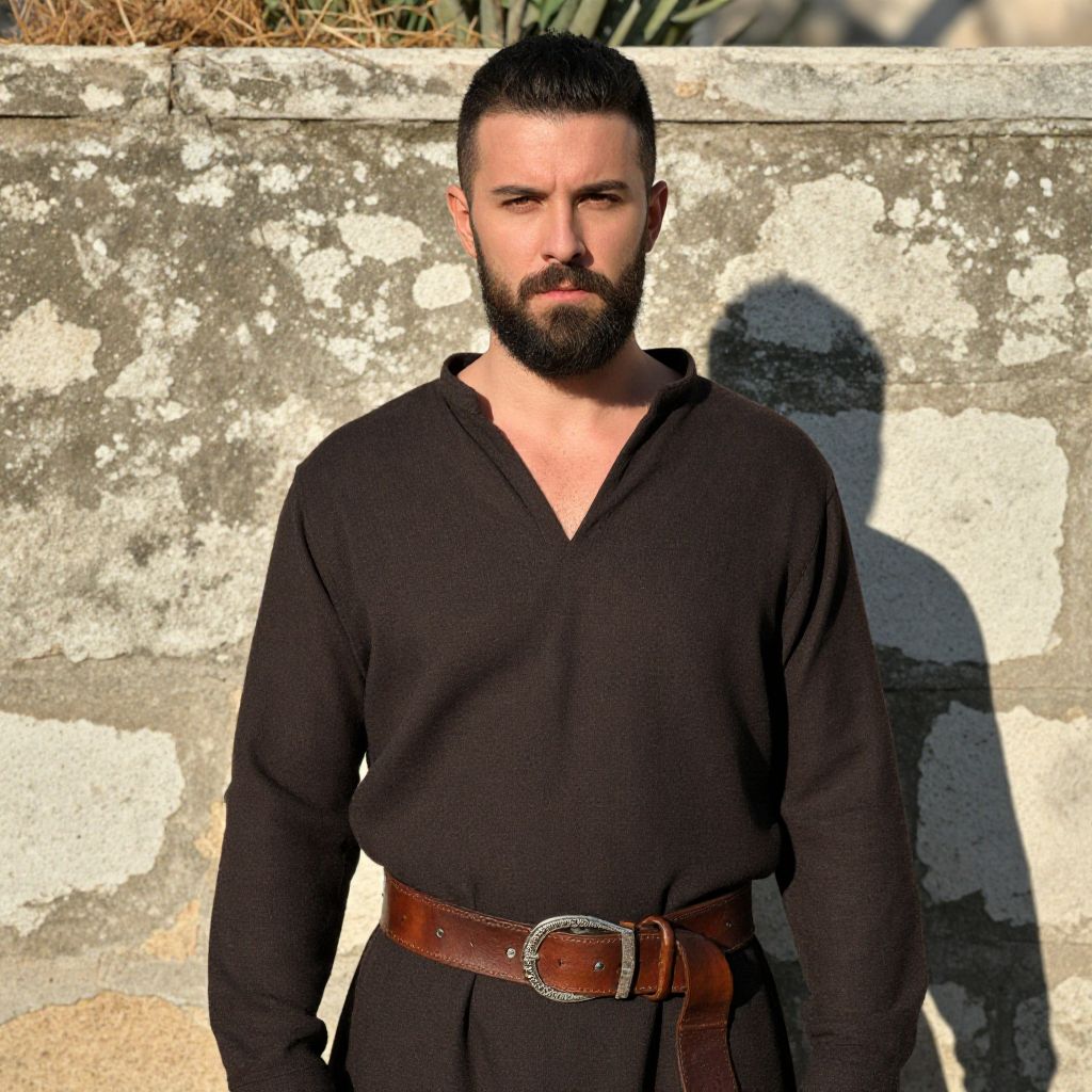 A man with a full beard stands confidently in front of a rustic stone wall, wearing a simple dark brown tunic cinched with a wide leather belt. The natural sunlight casts a clear shadow behind him, highlighting his serious expression and medieval-inspired attire.