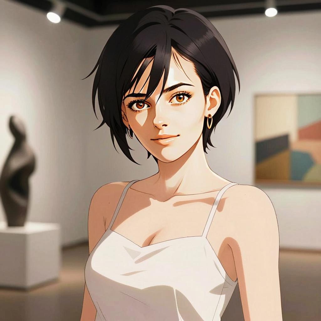 A digitally illustrated woman with short black hair and warm brown eyes stands confidently in a modern art gallery, wearing a simple white spaghetti strap top. The artwork and sculptures in the softly lit background complement the sleek and contemporary anime-style portrait, highlighting a blend of artistic refinement and youthful elegance.