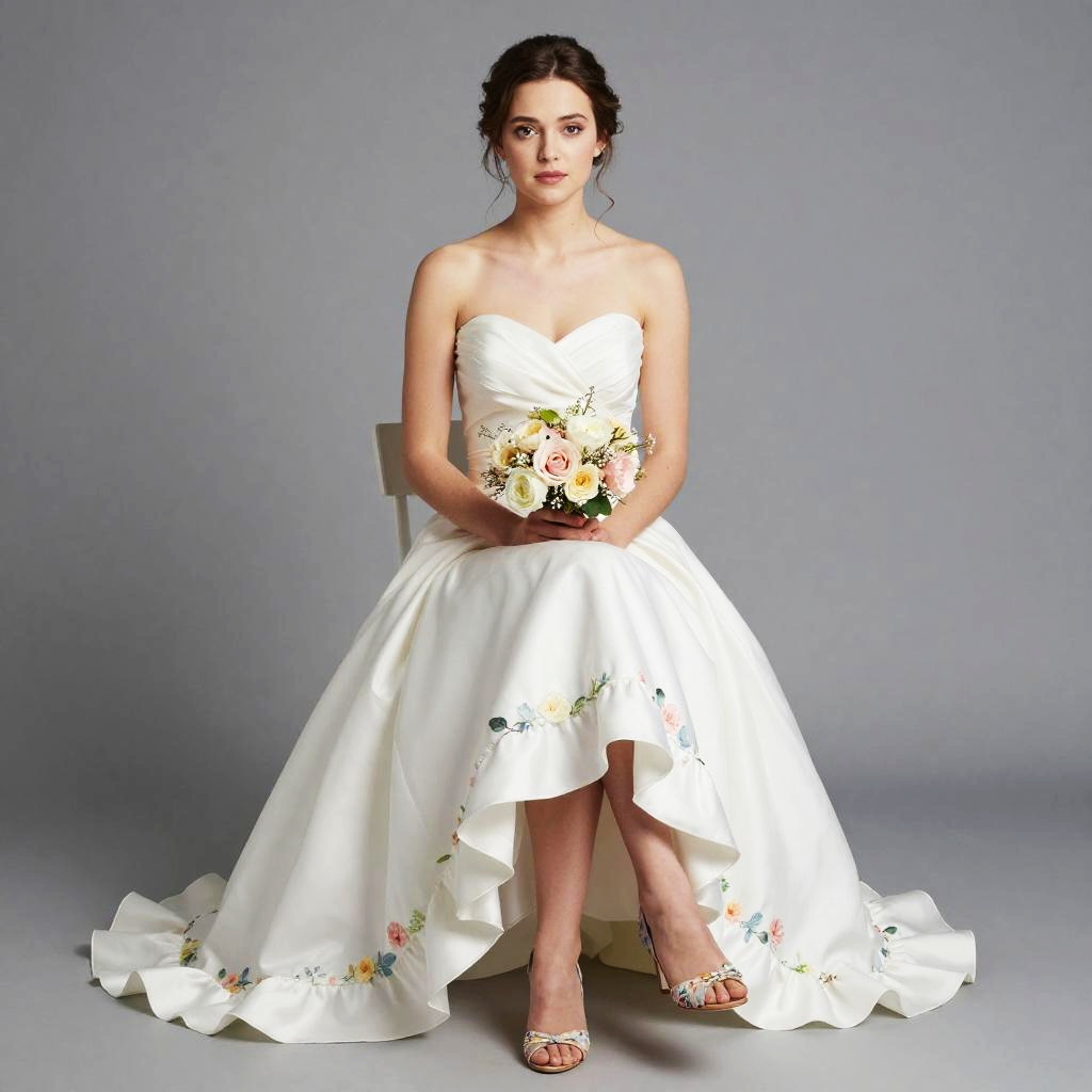 A young woman sits elegantly in a strapless white wedding gown featuring a high-low hemline adorned with delicate floral embroidery. She holds a bouquet of soft pastel roses and greenery, complemented by matching floral heeled sandals, all set against a simple gray background emphasizing the bridal style.