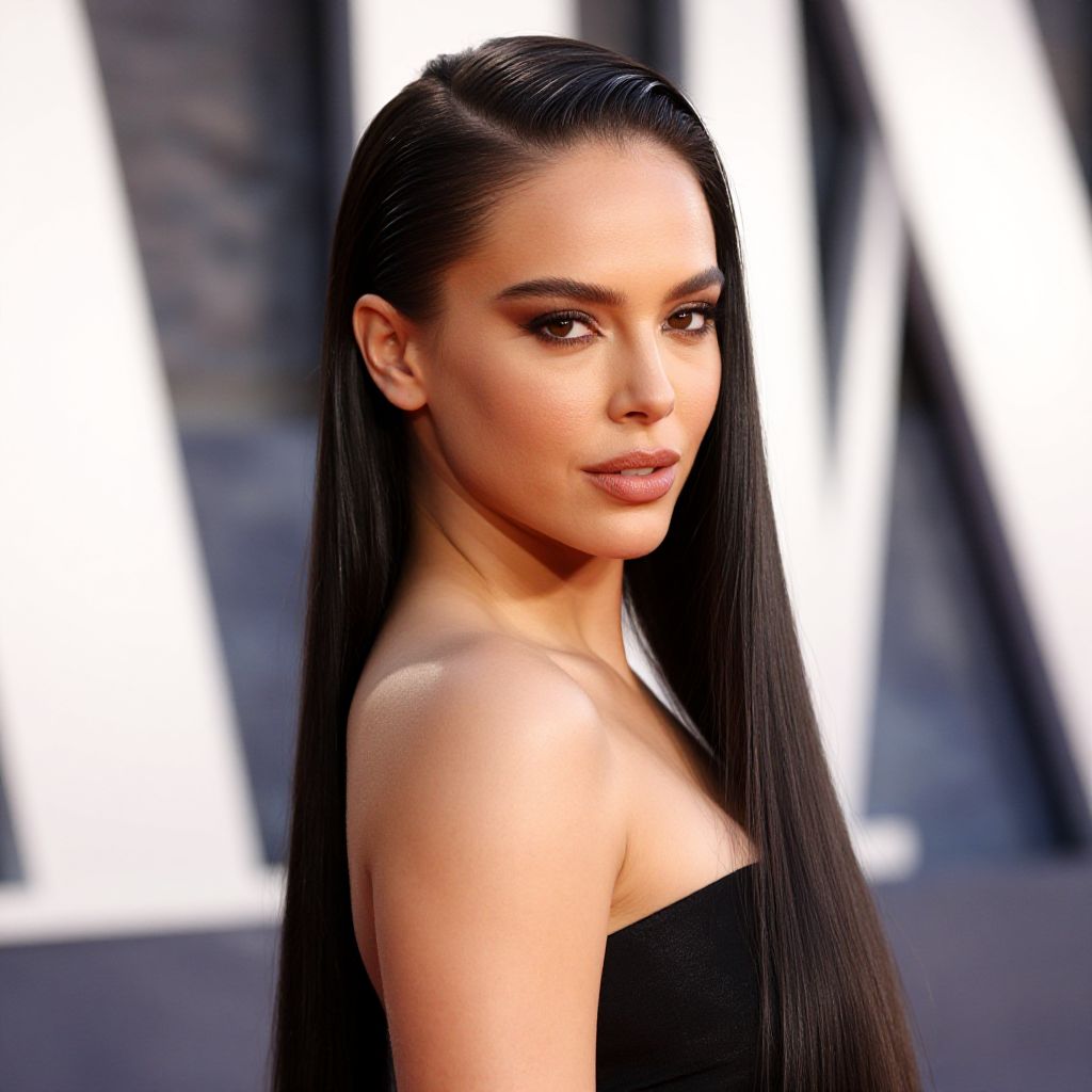 A close-up portrait of a confident woman with long, sleek, dark hair styled back, wearing a strapless black outfit. The image captures her poised expression and flawless makeup in soft, natural lighting against a blurred background.