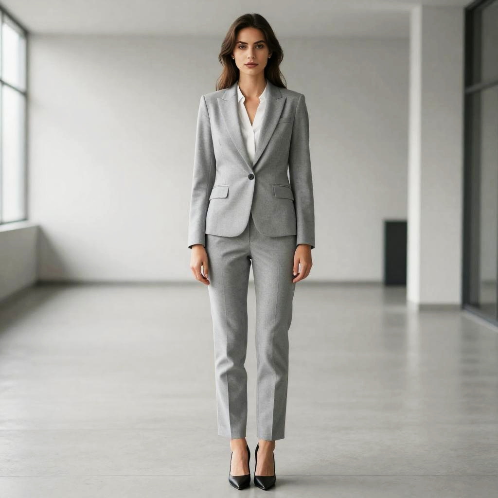 A confident woman stands in a modern, spacious office environment wearing a trendy gray business suit paired with a white blouse and black heels. The tailored fit and minimalist style of her attire highlight a professional and sophisticated look suitable for corporate settings.