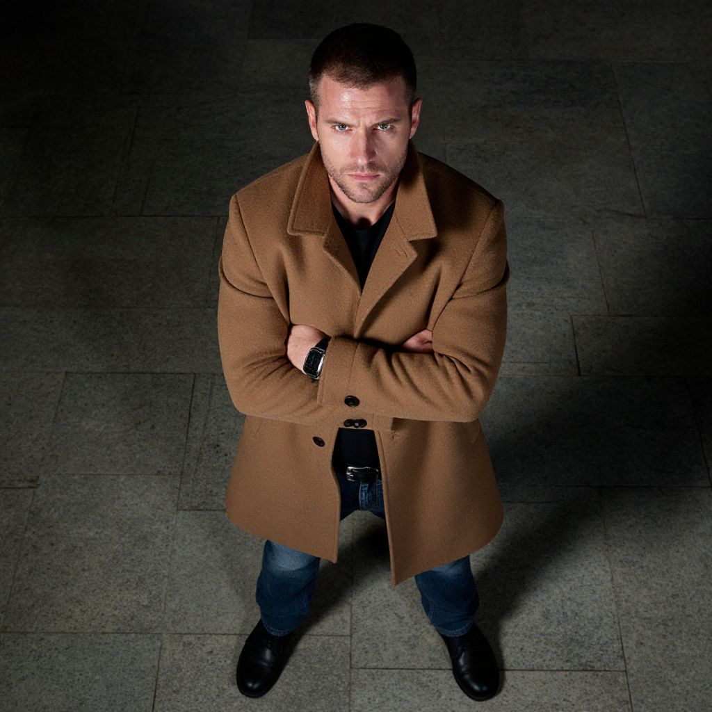 A confident man stands with his arms crossed, looking directly up with a focused and intense expression. He is dressed in a stylish camel brown coat over a black shirt, paired with blue jeans and black shoes, set against a neutral stone tiled background.