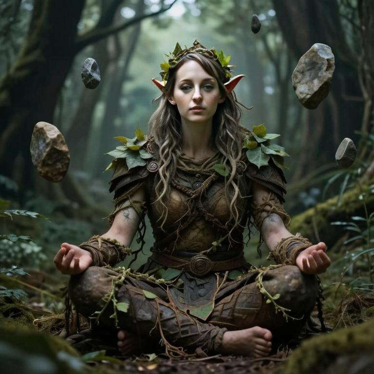 Elf Woman Meditating in Forest with Levitating Rocks Fantasy Cosplay