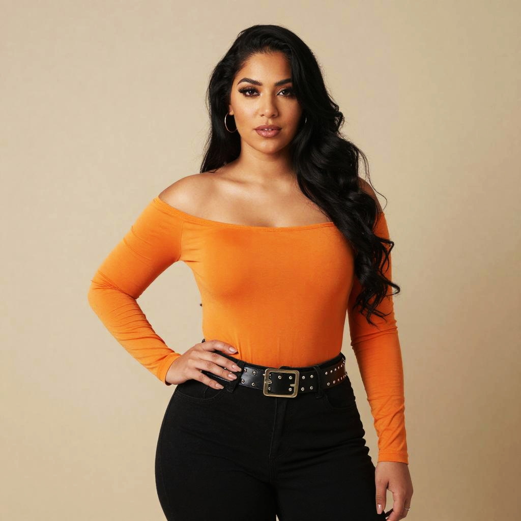 A confident woman poses against a plain beige background wearing a vibrant orange off-the-shoulder top and high-waisted black jeans with a studded belt. Her long dark hair cascades over one shoulder, complementing her poised and stylish appearance.