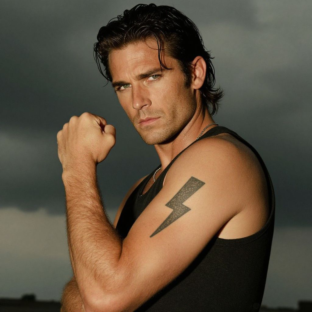 A confident man poses with his arm flexed, showcasing a bold lightning bolt tattoo on his upper arm. He wears a black sleeveless shirt, and his intense gaze complements the moody, overcast sky in the background, adding a dramatic effect to the portrait.