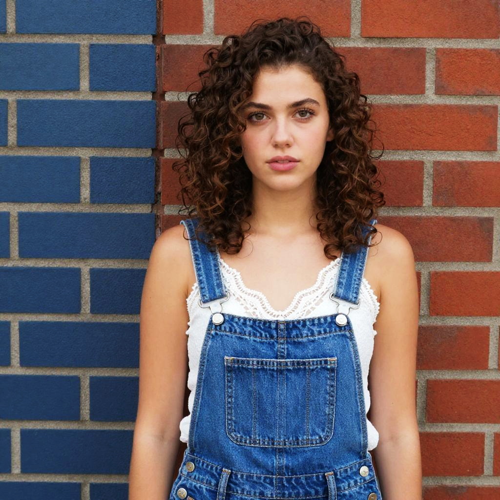 A young woman with curly hair stands confidently against a background of two-tone brick wall, featuring contrasting blue and red bricks. She wears a white lace-trimmed top paired with denim overalls, conveying a casual and effortlessly stylish look.