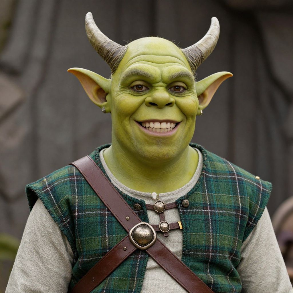 A man dressed as a green ogre character with large curved horns, pointy ears, and a broad smile, wearing a plaid green vest with leather straps. The high-quality costume and makeup create a fantasy-inspired appearance reminiscent of well-known fairytale and fantasy movie characters.
