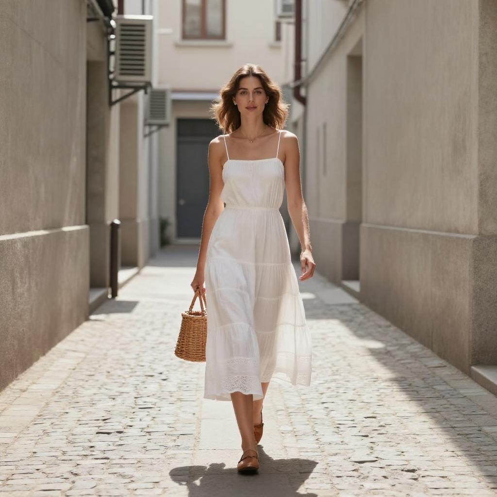 A young woman walks confidently down a sunlit cobblestone street, wearing a flowing white summer dress with thin straps. She carries a woven basket bag and wears brown sandals, embodying a simple, elegant, and natural style perfect for warm weather.