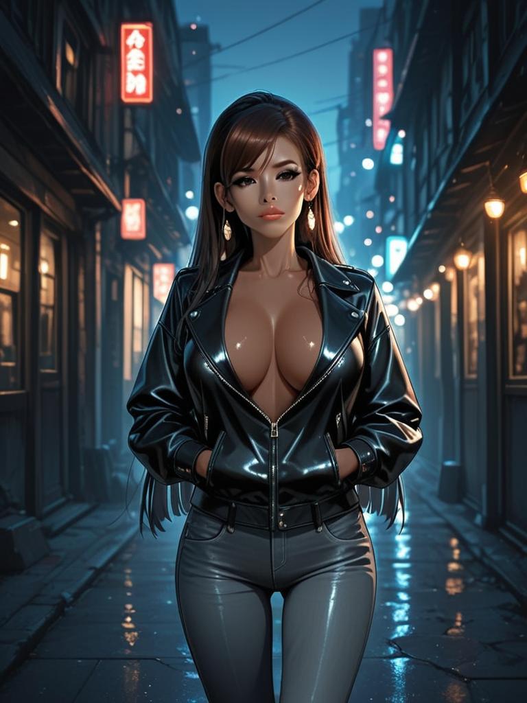 A digitally illustrated woman stands confidently in a dimly lit urban alleyway, dressed in a shiny black leather jacket and tight pants. The neon signs and soft streetlights create a moody cyberpunk atmosphere, enhanced by the glossy textures and detailed rendering of the character in a modern anime-inspired style.