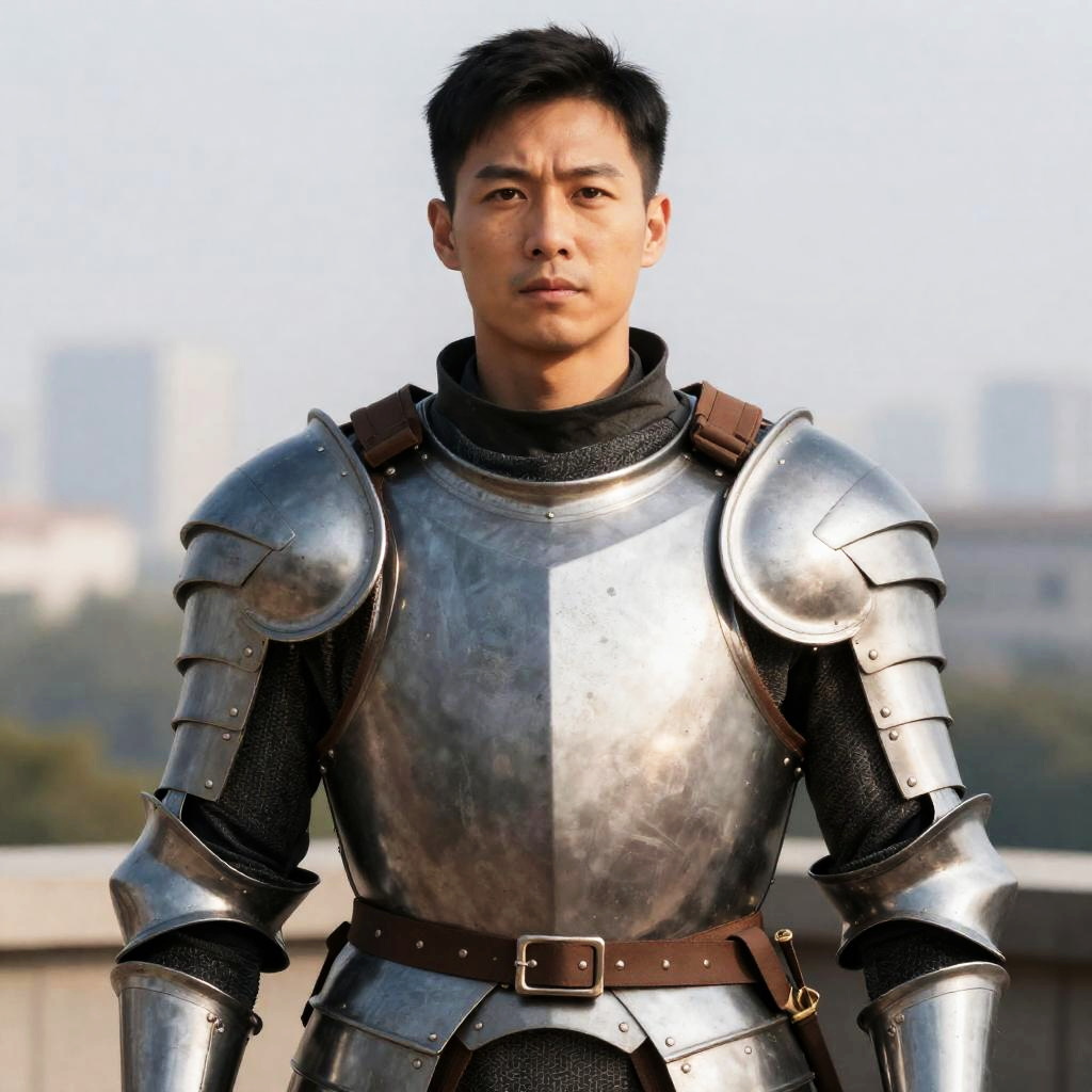 A man wearing a detailed suit of medieval armor stands against a blurred cityscape background, exuding a strong and determined presence. The close-up captures the metallic shine and intricate design of the armor, highlighting its authentic knightly style.