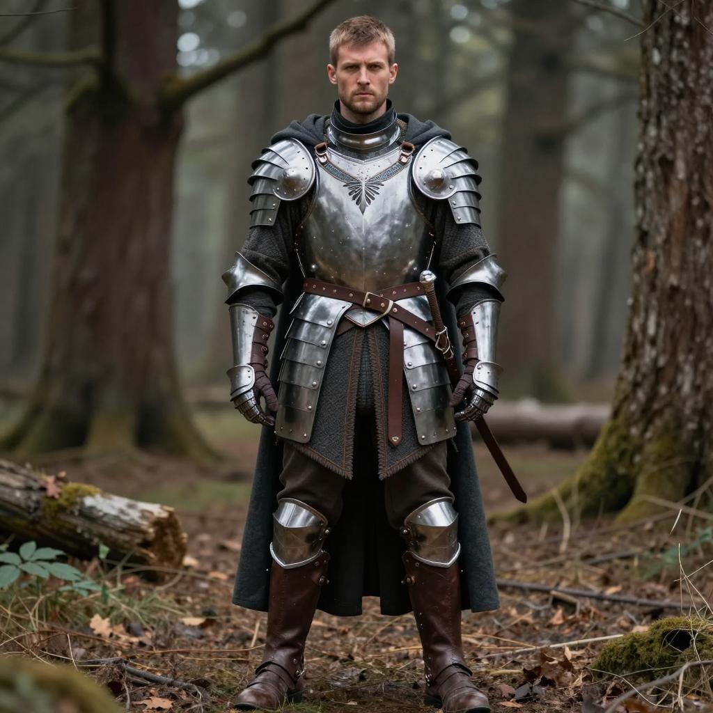 A man dressed in fully detailed medieval knight armor stands resolutely in a dense forest setting, evoking a strong and noble presence. The polished steel plate armor combined with a dark, heavy cloak highlights a realistic and historically inspired style, reflecting the valor and strength of a traditional knight.