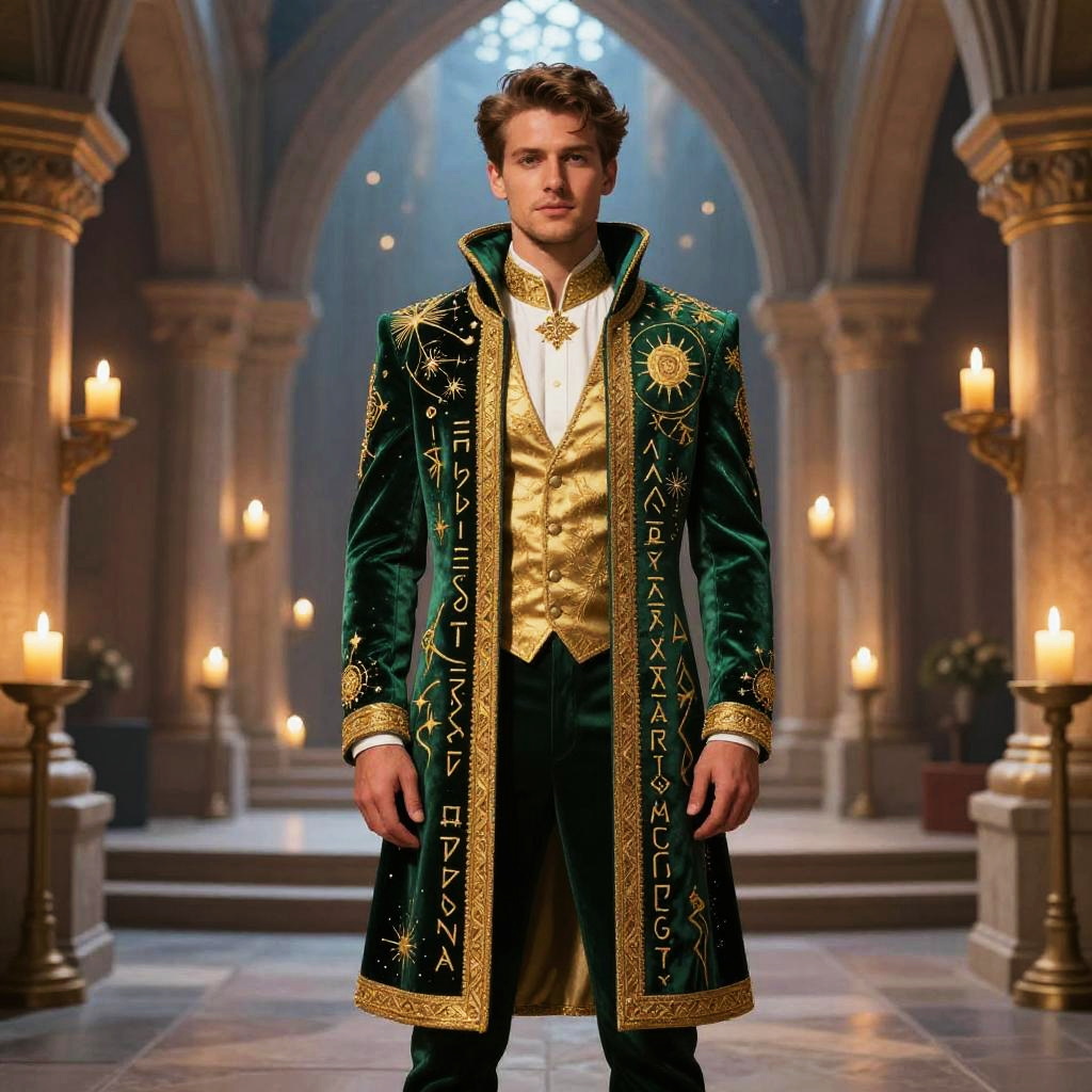 A young man stands confidently in an ornate medieval-style hall, dressed in an elaborate green velvet coat richly embroidered with golden celestial symbols and mystical runes. His golden vest and white shirt add a regal touch, evoking a fantasy or historical-inspired aesthetic that blends elegance with enigmatic charm.