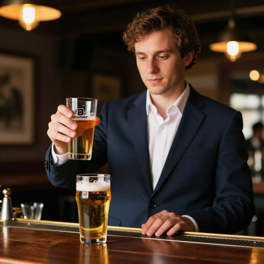 Man in Suit Standing at Bar Holding Glass of Beer for Day Drinks