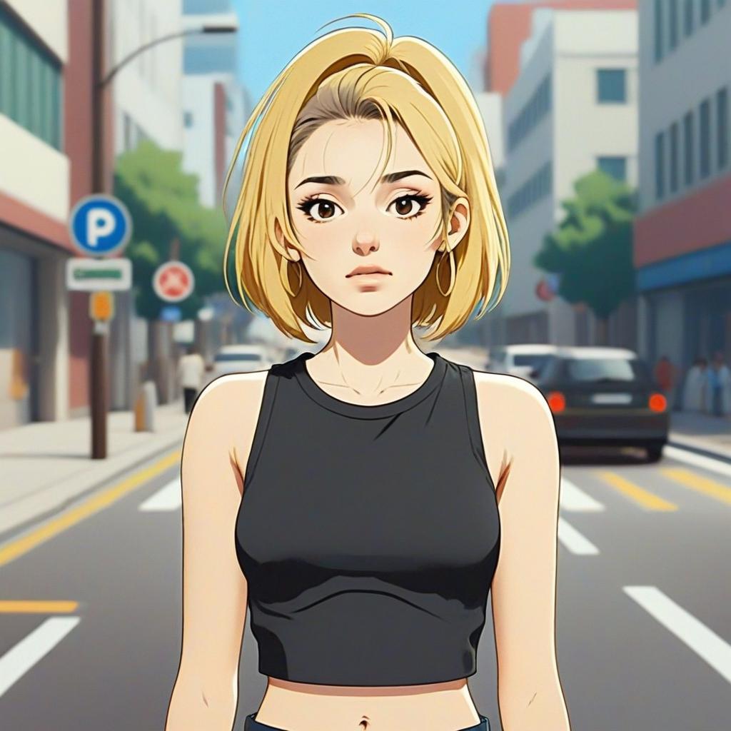 A digitally illustrated young woman with blonde bob hair stands confidently in the middle of a city street. The clean, vibrant anime-style artwork highlights her expressive brown eyes and casual black sleeveless crop top, set against a softly blurred urban background.