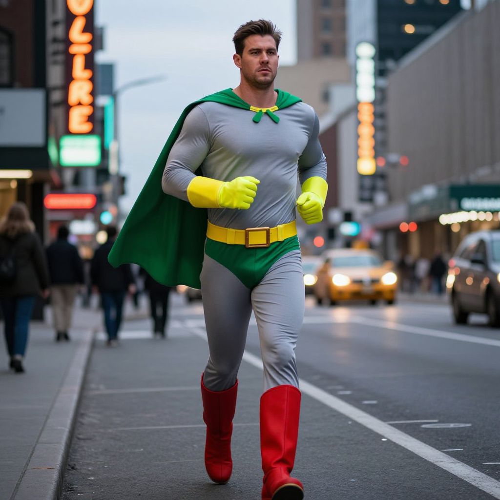 A man dressed in a colorful superhero costume, featuring a green cape, yellow gloves, and red boots, is running along a city street. The photo captures an urban setting with blurred pedestrians and cars in the background, highlighting a dynamic and heroic atmosphere.
