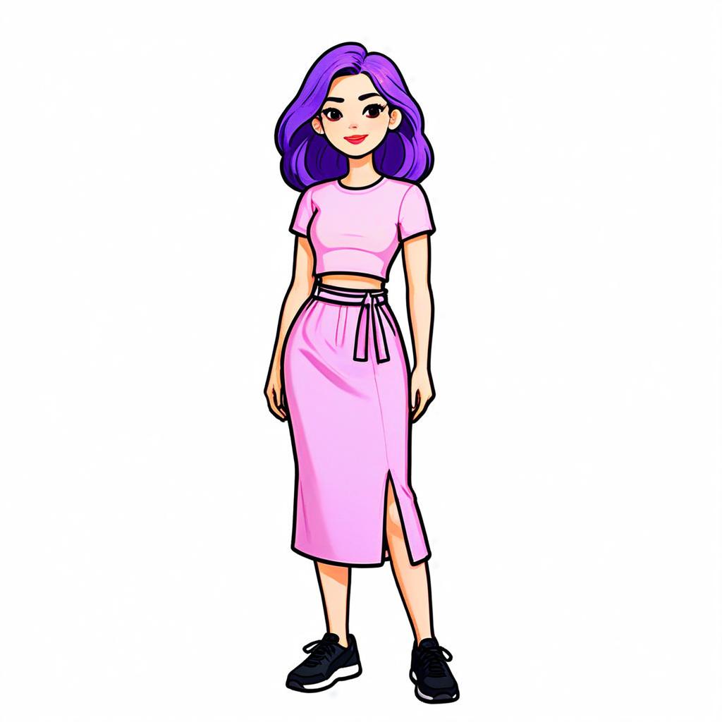 This vibrant digital illustration features a stylish woman with striking purple hair, dressed in a casual chic light pink cropped top and matching high-waisted skirt with a side slit, paired with black sneakers. The artwork captures a modern and trendy fashion style with clean lines and bright colors, highlighting the confident and fashionable character.