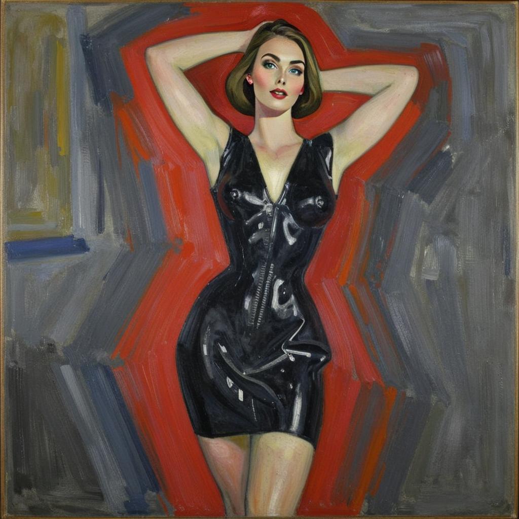 Stylized Portrait of Woman in Shiny Black Dress with Bold Expressionist Background