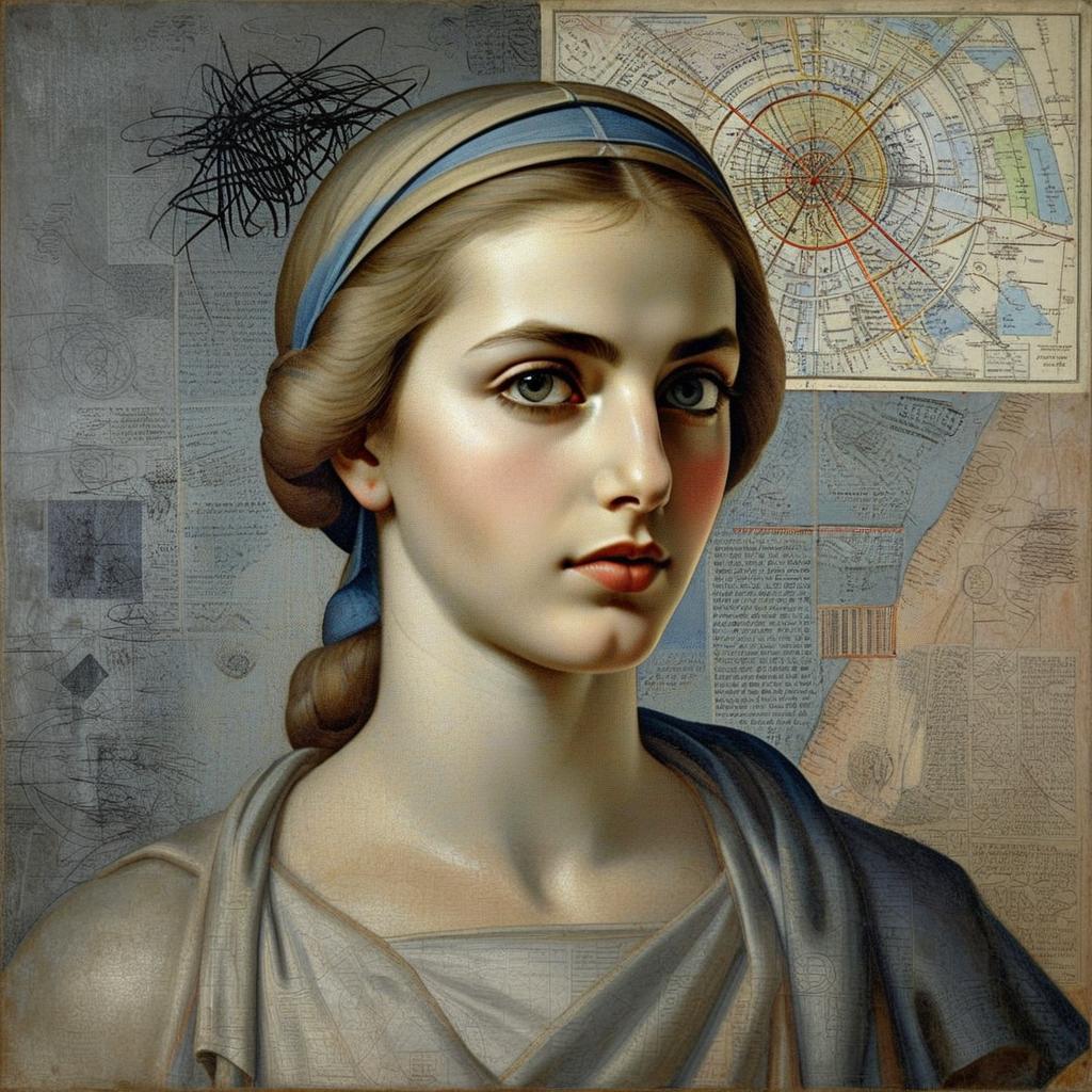 A detailed and realistic portrait of a young woman with a serene expression, wearing a blue headband and classical draped clothing. The background features intricate maps and sketches, blending elements of classical portraiture with modern scientific illustration.