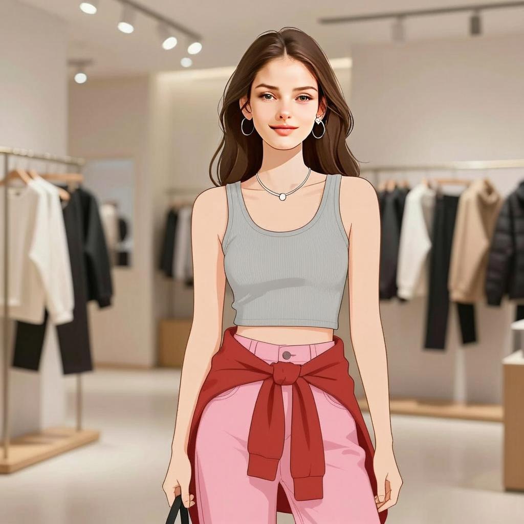 A digital illustration of a stylish woman with long hair smiling confidently in a modern clothing store. She wears a grey cropped tank top paired with high-waisted pink pants and a red sweater tied around her waist, accessorized with hoop earrings and a delicate necklace. The image showcases a clean, contemporary fashion look in a softly lit, minimalist retail setting.